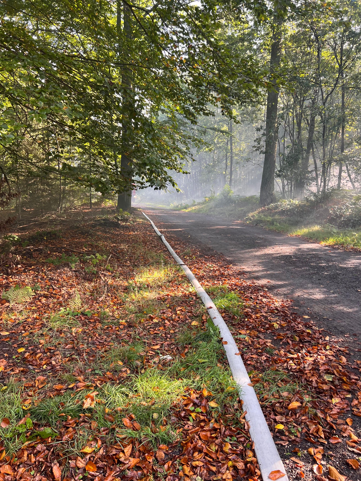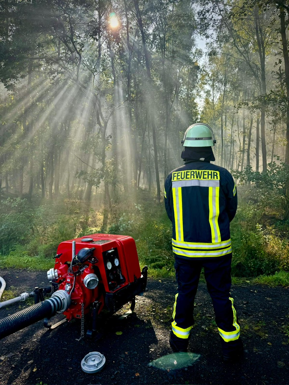 Neben der eigentlichen Brandbekämpfung zielte diese Übung aber auf ganz verschiedene Herausforderungen in solchen Einsätzen ab. Geübt wurde die Wasserversorgung über eine lange Wegestrecke. Dabei muss Wasser durch teilweise Kilometer lange Schläuche geführt werden. Aber auch ein Pendelverkehr, denn die Wasserquellen im Wald sind rar gesät und gerade im Sommer oft nur sehr wenig ergiebig. Also muss Wasser aus anderen Quellen, meist aus den städtischen Versorgungsleitungen, entnommen werden. Da diese aber in der Regel zu weit für Schlauchleitungen entfernt sind, wird mit Tankfahrzeugen ein Pendelverkehr vom Hydranten zu einer Übergabestelle eingerichtet, an der das Wasser in einem großen Behälter gepuffert wird und dann von dort mit Schlauchleitungen zur Einsatzstelle befördert wird. Hier kamen dann auch der TW14000 der Feuerwehr Königswinter und der Wasserförderungszug des THW OV Bad Honnef zum Einsatz.